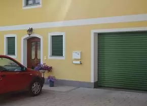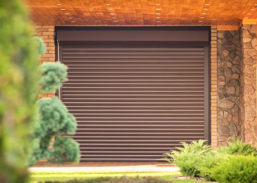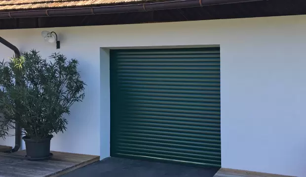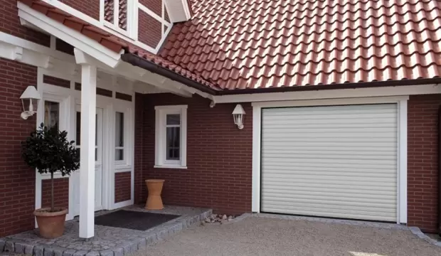 Короб ворот располагается внутри проема. Благодаря этому на фасаде нет выступающих элементов.
